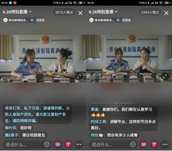 6月26日上午,邢台市强制隔离戒毒所和邢台市广播电视台新闻综合频道联合举办了“健康人生·绿色无毒”禁毒专题抖音直播,直播时长55分钟,累计观看人数一万余人。