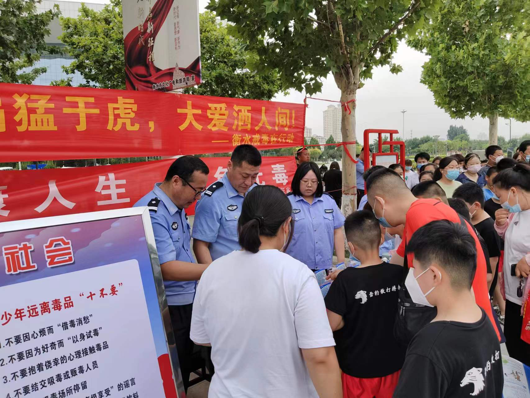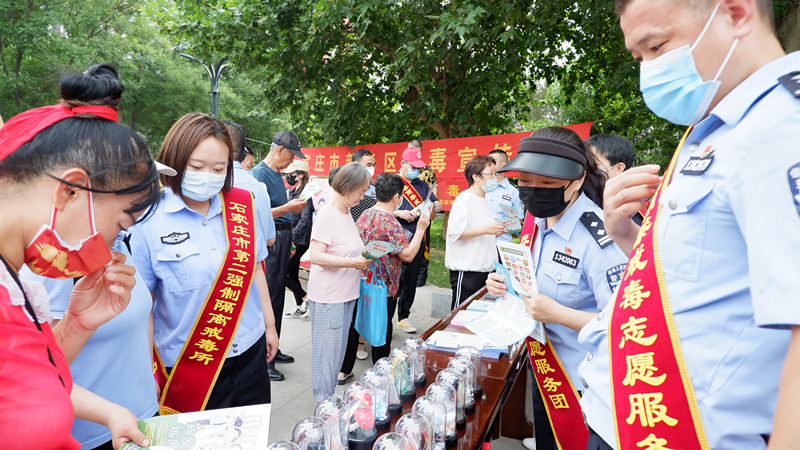 6月26日,石家庄市第二强制隔离戒毒所春雨禁戒毒志愿服务团联合石家庄市公安局新华分局、新华区戒毒康复服务中心、石家庄市药品不良反应监测中心在新华区水上公园共同举办了“健康人生、绿色无毒”国际禁毒日主题宣传活动。