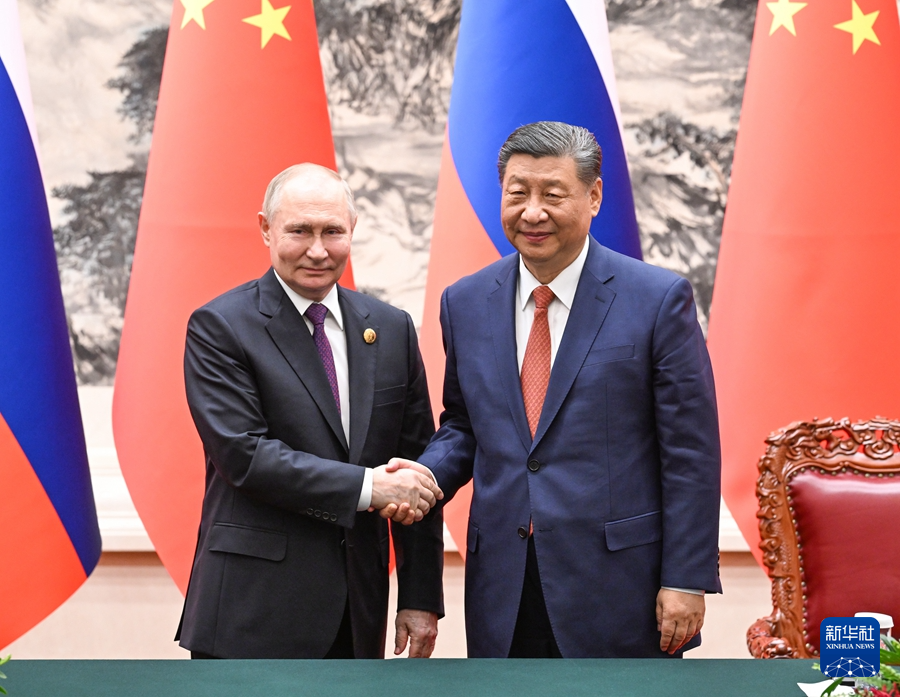 习近平指出,普京总统这次对中国进行国事访问,是他开启新一届总统任期后的首次访问,充分体现了普京总统本人和俄方对发展中俄关系的高度重视。我对普京总统到访表示热烈欢迎。刚才,我同普京总统举行了坦诚友好、内容丰富的会谈,全面总结了建交75年来两国关系发展的成功经验,就双边关系以及共同关心的重大国际和地区问题深入交换意见,对下阶段两国关系发展和各领域合作作出规划和部署。我们还共同签署并发表《中华人民共和国和俄罗斯联邦在两国建交75周年之际关于深化新时代全面战略协作伙伴关系的联合声明》,见证了多项两国政府间和部门间重要合作文件签署,为中俄关系健康发展注入了新的强劲动力。