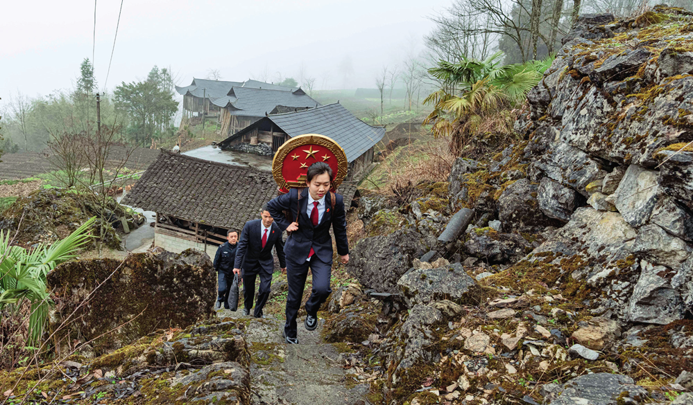 湖北省鹤峰县人民法院积极推行巡回送法进乡村活动,通过现场宣讲、模拟庭审、法律咨询等方式,普及法律知识,化解基层纠纷矛盾,助力乡村振兴。图为法庭工作人员在前往鹤峰县中营镇的路上(2023 年 2 月 28 日摄) 覃涛摄/本刊