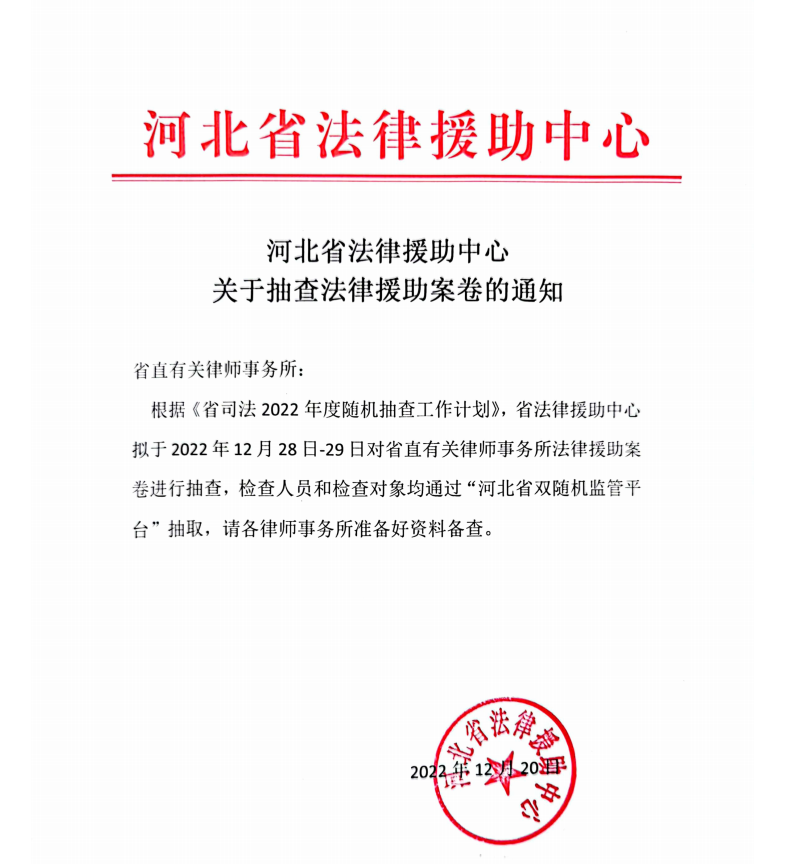 河北省法律援助中心关于抽查法律援助案卷的通知